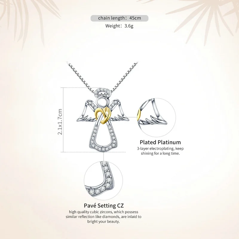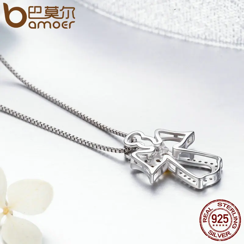 Promo BAMOER Authentic 925 Sterling Silver Guardian Angel Heart Pendant Necklaces Dazzling CZ Luxury Ster